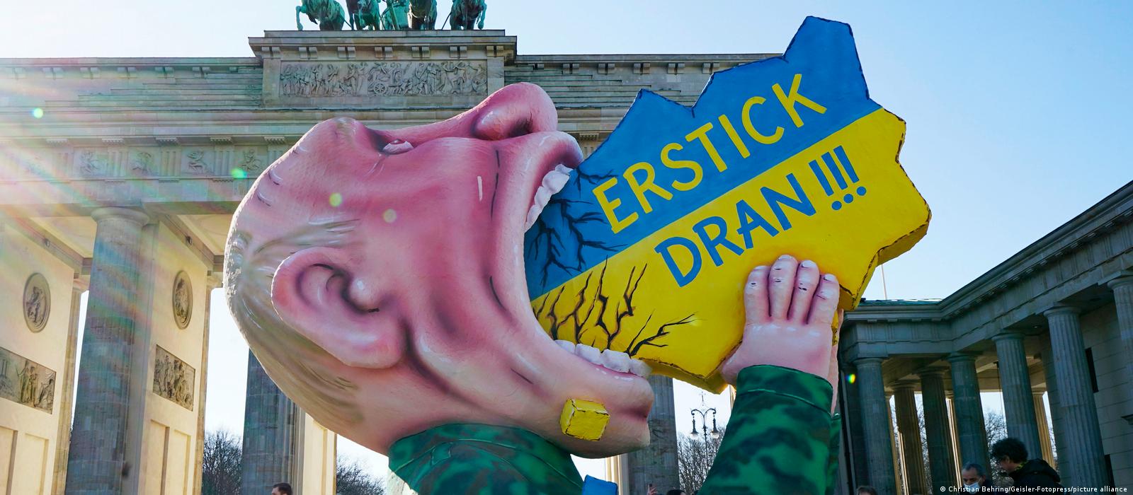 "Ненасытный Путин" выставлен на аукцион в Германии .......После начала войны 24 февраля Тилли спонтанно решил создать новую сатирическую повозку, на которую водрузил огромную фигуру Путина из проволоки и папье-маше. Российский президент заглатывает карту Украины, на ее сине-желтом фоне размещена надпись "Подавишься!" В рамках частной инициативы Тилли провез свою повозку по центру Дюссельдорфа в "бешеный понедельник", позже она побывала в Берлине на демонстрации за мир и некоторое время стояла у Бранденбургских ворот, неподалеку от которых находится посольство РФ. https://www.dw.com/ru/nenasytnyj-putin-vystavlen-na-aukcion-v-germanii/a-62525630