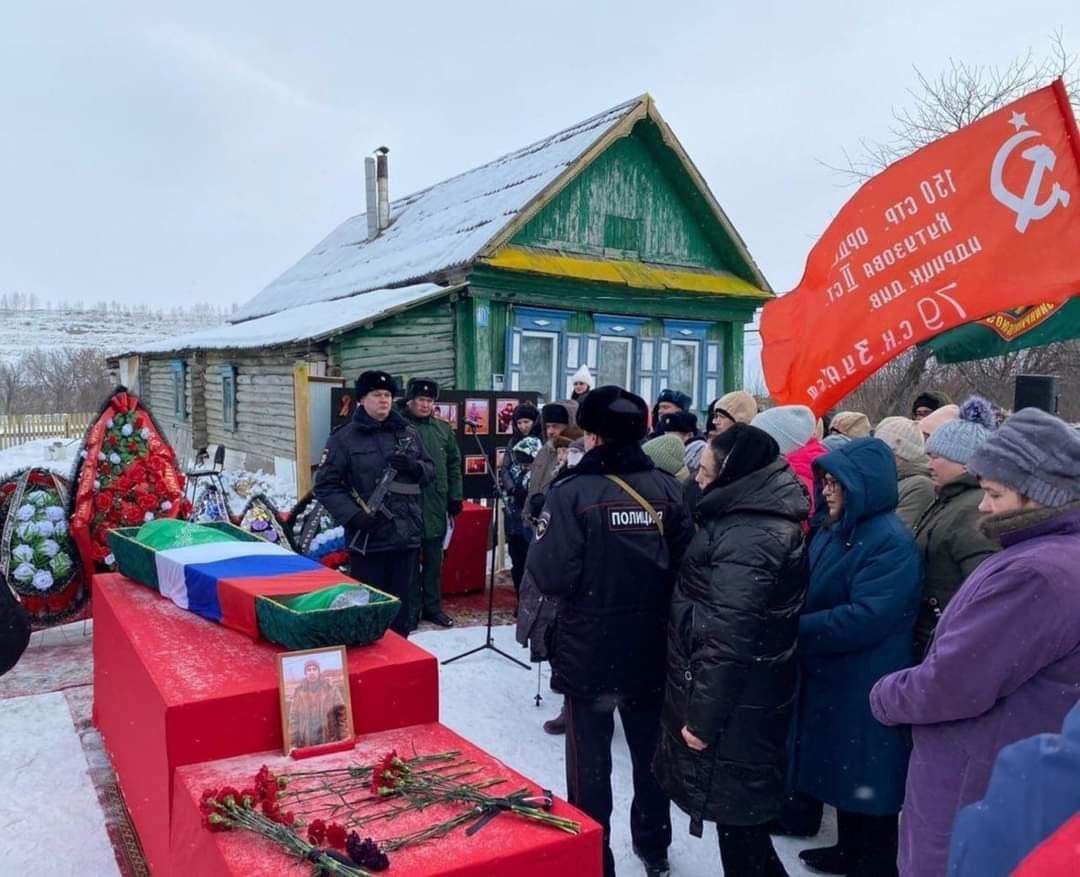 Флаги, полиция, обветшалая изба и гроб. Это Россия XXI века. Фото из канала правда Геращенко
