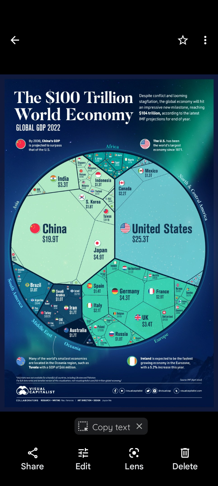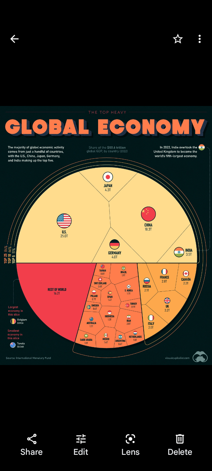 "...А санкции то работают! Впервые с 2014 года Россия вернулась в десятку стран с самым высоким ВВП не смотря на рекордное количество санкций, введённые против какой-либо страны за всю историю. С 2015 года Россия не поднималась выше 11-й строчки, опускалась до 15-й а по итогам 2022 года заняла 9-ю, обойдя Бразилию и Италию. Плюсом ко всему устояла национальная валюта, а безработица закрепилась на исторических минимумах, Скажем спасибо нашим западным партнёрам!..." Идём по ссылке https://www.visualcapitalist.com/countries-by-share-of-global-economy/ Смотрим на опубликованный отчёт от 29 декабря 2022 (розовый чат) Находим Россию. Опаньки! 2.1Т (!!!) на конец года. (доля от мирового GDP, который,$101.6 T). Теперь на том же самом сайте - отчёт о состоянии мировой экономики на 12 июля 2022 года (голубенький чат). Находим Россию. Едрыть твою... $1.8T(!!!). Я правильно понимаю, что за шесть месяцев этого года, с июля по декабрь, под тяжестью 9-ти пакетов с санкциями экономика России приросла 0.3Т (ТРИЛЛИОНАМИ, КАРЛ!!!) Работают санкции