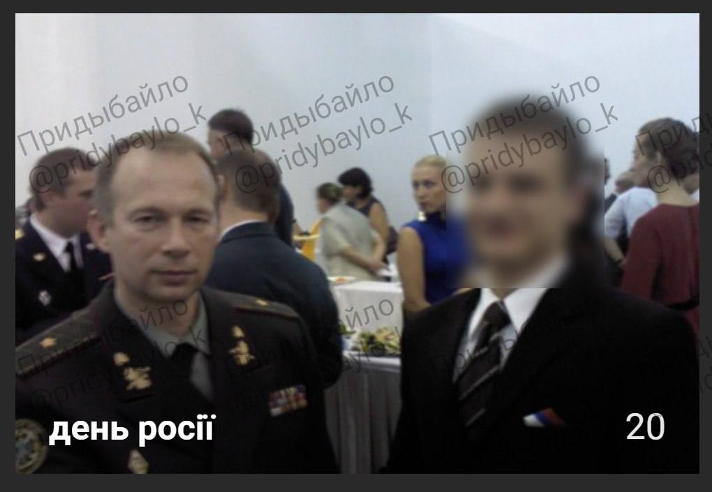 А в 2013-м ел торт с украинским и российским флагом на верхушке, обнимался с российскими военными на приёме. Лица на фото я замазал, потому что не удалось точно определить где находятся участники того праздника сейчас, кроме Сырского.
