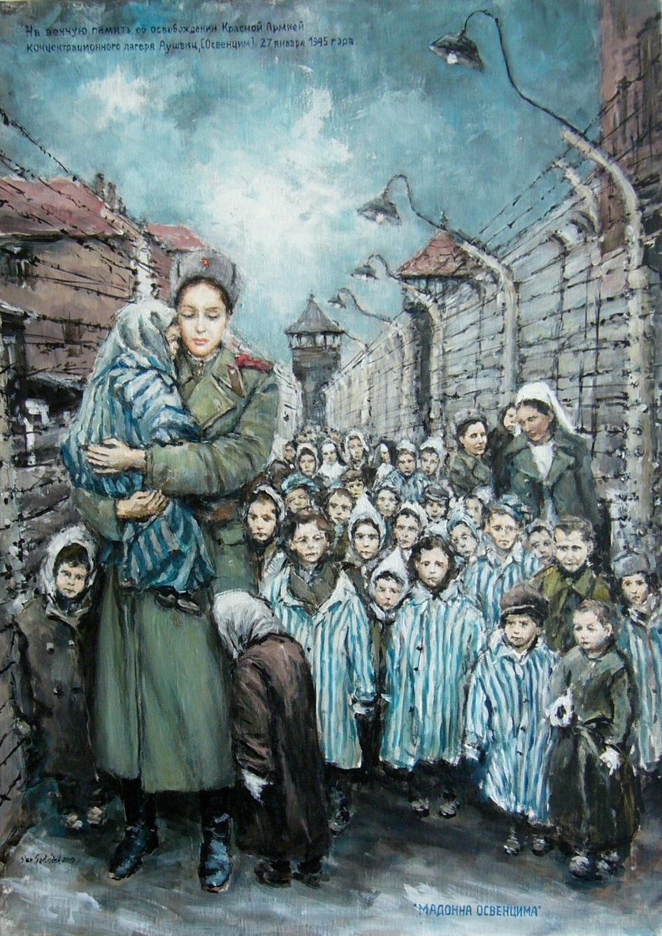 НЕ ОСКУДЕЛА ЗЕМЛЯ! СПАСИБО ЗА ПАМЯТЬ! К великому сожалению, на волне русофобской истерии, развернувшейся во многих странах Европы, отношение к Второй Мировой войне сейчас активно пересматривается и в Чехии . Некоторые чехи начали называть советских солдат не освободителями, а новыми оккупантами, которые пришли на смену немцам. Но не все чехи придерживаются этой скандальной и насквозь лживой точки зрения! Посольство России в Чехии сообщило, что известный чешский художник Станислав Седлачек передал в дар нашей стране свою картину "Мадонна Освенцима". Полотно уже наделало немало шума в Чехии. Художника обвинили в "оправдании" советской оккупации и "потакании российской пропаганде". Тем не менее, многие чехи, глядя на эту картину, вспомнили простой факт: 27 января 1945 года Красная Армия освободила оставшихся в живых узников концентрационного лагеря Аушвиц (Освенцим). Не американская армия, не британская, не французская. Красная Армия Советского Союза. Простые парни и девушки. Наши деды. Они освободили Освенцим, они первыми увидели те ужасы, что творили в лагере нацисты. К нашим дедам и бабушкам потянули свои ручонки исхудалые дети с запавшими до черноты глазами. Наши деды и бабушки, прошедшие через горнило самой страшной войны, вздрагивали от ужаса, глядя на то, что творили с людьми эсэсовцы. И кто-то считает, что это можно забыть? В этом лагере, ставшем настоящей фабрикой смерти, было уничтожены больше 4 тысяч граждан Чехословакии, в основном - женщины и дети. Их привезли сюда из концентрационного лагеря Терезин, и в ночь с 8 на 9 марта 1944 года отправили в газовые камеры. На картине Станислава Седлачека мы видим эпизод освобождения оставшихся в живых детей из Освенцима. Если бы не тюремные робы ребятишек, не жуткие заборы с колючей проволокой и не обмундирование женщин, можно было бы подумать: детский сад на прогулке. Дети доверчиво прижимаются к женщинам - очевидно, что они, жестоко оторванные от матерей, соскучились по материнской ласке. На некоторых ребятах - солдатские ушанки, один мальчик даже одет в гимнастерку. Эти вещи им отдали солдаты. На переднем плане - молодая женщина, солдат Красной Армии. Она держит на руках закутанную в одеяло девочку. Еще одна девочка прижимается к ногам женщины. Лицо главной героини картины выражает скорбь и боль, ее ресницы опущены. Что может быть тяжелее для женщины - чем видеть страдания детей, понимать, через что они прошли? Художник назвал картину "Мадонна Освенцима". И перед нами, действительно, Мадонна. Ангел, который спустился в созданный людьми безумный ад, чтобы вывести оттуда невинных. Среди фото под этим постом есть архивные кадры того дня, когда были освобождены выжившие в концлагере. Напомним, в прошлом году Посольство США в Дании разместило сообщение, в котором утверждается, что концлагерь Аушвиц (Освенцим) якобы освободили американские солдаты. В Европе остается все меньше знаковых монументов, напоминающих о подвиге солдат Красной Армии, освободивших Старый свет от последователей нацизма. Спасибо Станиславу Седлачеку за эту великолепную картину! Спасибо за правду и спасибо за смелость!