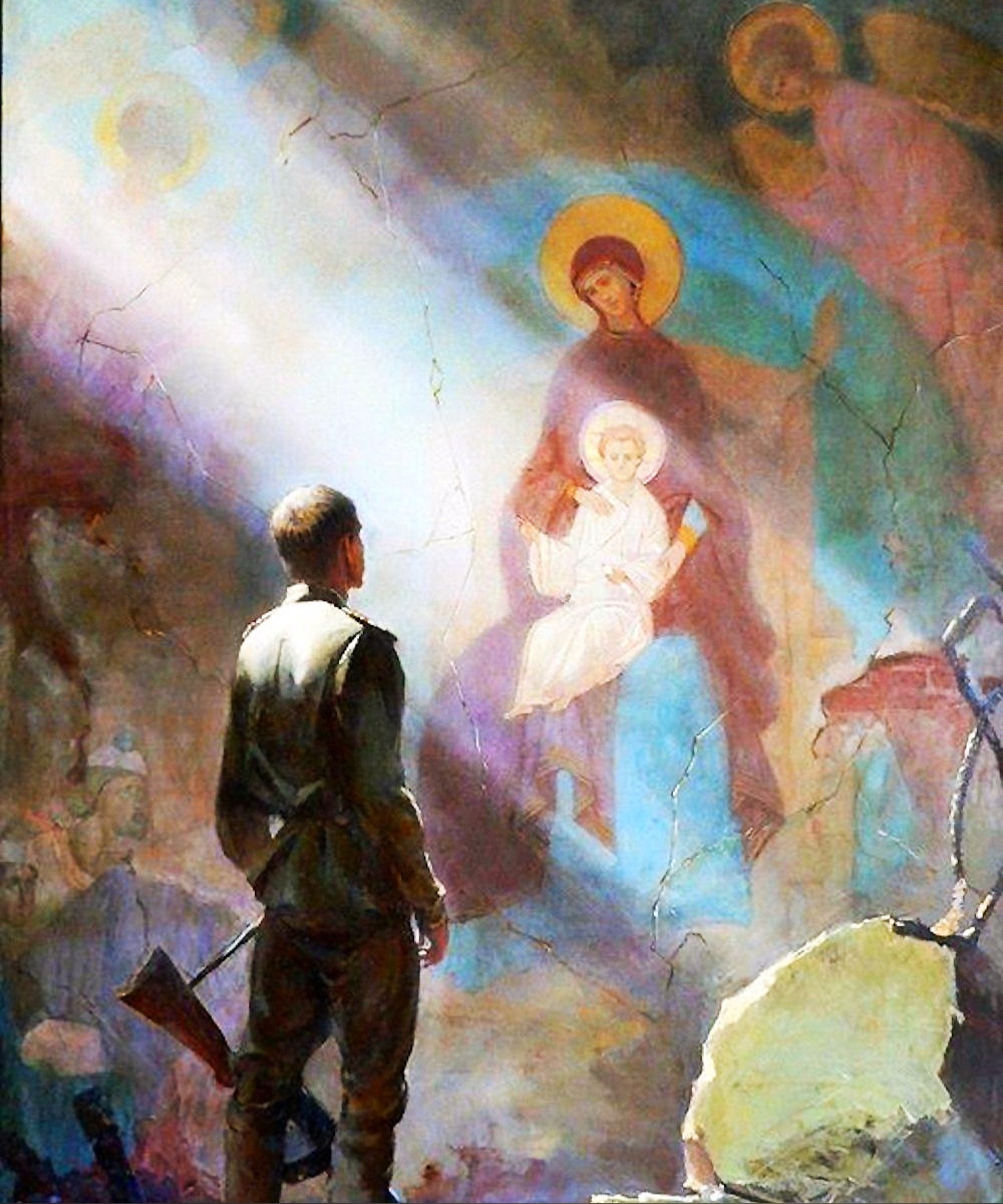 Подошла к моей постели, перекрестила меня один раз. Я смотрю ей в глаза, она тоже смотрит мне в глаза. Второй раз меня перекрестила. А справа от меня спал Костя Шевчук. Я его бужу, говорю: «Костя, Богородица, Божья Матерь пришла!» Он глаза открыл, посмотрел, никого не увидел. И говорит: «Витя, тебе же на войну скоро. Ложись спи…» Женщина постояла немного, перекрестила меня в третий раз. И тихонько, как бы плывя, вышла из палатки.