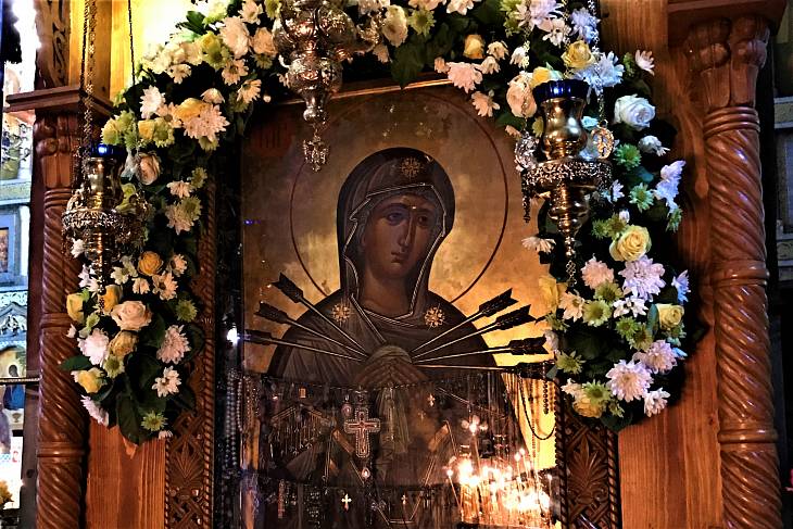 26 августа "Семистрельная" икона Божией Матери О первом прославлении иконы сохранилось следующее предание. Один крестьянин Кадниковского уезда Вологодской губернии в продолжении многих лет страдал хромотой и расслаблением. Все средства, которые он использовал для лечения своей болезни, не приносили ему никакой помощи. Однажды во сне он услышал голос, который велел ему найти на колокольне Иоанно-Богословской церкви икону Богоматери и помолиться перед ней, и тогда он получит исцеление. Крестьянин два раза приходил в церковь, но на колокольню его не пускали, а рассказу о сне не поверили. Но крестьянин был настойчив и третий раз пришёл в храм. Служители церкви сжалились над больным и выполнили просьбу. Как только крестьянин поднялся на колокольню, он сразу нашёл икону. Икона лежала на полу, а звонари и не замечали этого, проходя по ней каждый день как по половой доске. Святыню отчистили от сора и грязи, отслужили молебен и с почестями установили в храме. Крестьянин же усердно молился перед иконой и впоследствии получил исцеление.