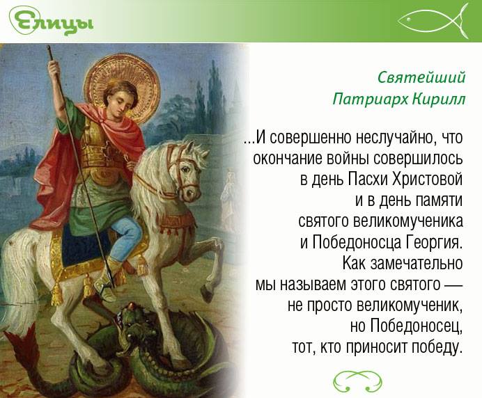 Не может быть победы без подвига, и речь идет не только о подвиге воинском и не только о победе в сражении. Каждому человеку нужно обязательно одерживать победы в своей жизни, иначе мало чего достигнешь. И если говорить о том, какую победу каждый из нас должен одержать и какая победа является самой главной, то можно сказать так: главная победа — это победа над самим собой. Это победа начинается с младенчества, с отрочества, с юности, когда мы должны во имя более высоких целей и идеалов ограничивать себя, налагать на себя ограничивающие нас дисциплинарные рамки, когда мы должны воспитывать в себе силу духа. Это начинается с самого небольшого, и каждый знает, как трудно бывает вставать рано утром, делать зарядку. Кому-то трудно посидеть и внимательно поработать над домашним заданием, когда на улице хорошая погода и сверстники гуляют. Но мы должны научиться совершать эти маленькие подвиги, ограничивая самих себя и воспитывая свою волю, свой разум, свои чувства. С этого подвига в детстве и юношестве и формируется способность человека совершать подвиги в жизни — великие подвиги, от которых зависит счастье и благополучие не только самого человека, но, может быть, множества людей, всей страны, всего нашего народа. Ведь именно так совершали подвиги герои Великой Отечественной войны, имена которых мы будем особенно вспоминать в День Победы. --- Из слова Патриарха Кирилла в день памяти святого Георгия Победоносца по окончании литургии в храме-памятнике на Поклонной горе, 6 мая 2018 года
