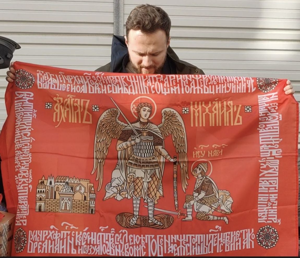 Забрал новую партию стягов для фронта. Очень красивые.