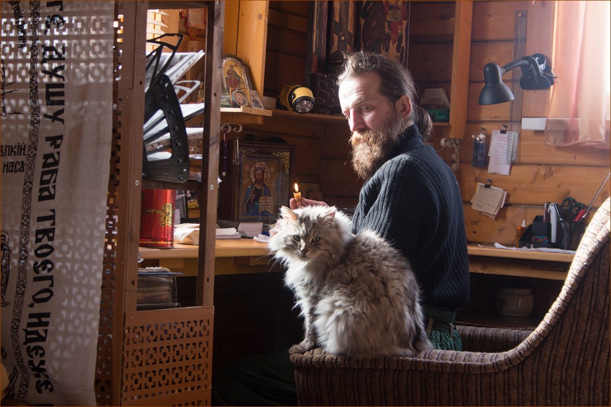 "Одна из трёх моих кисок,когда начинаю читать молитвы,ложится мне на шею в виде воротника,громко мурлыкает.Как только откладываю молитвослов,идёт по своим кошачьим делам."