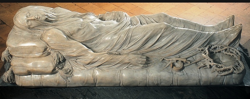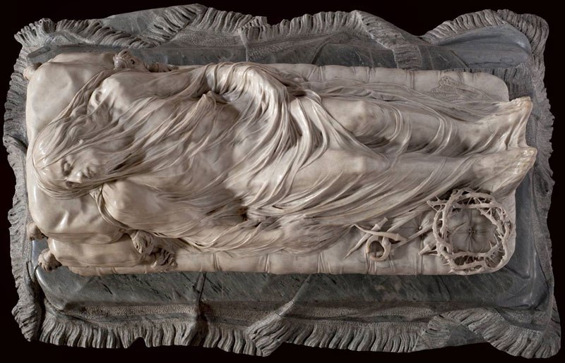 «Христос под плащаницей» – известнейшая скульптура Антонио Коррадини и Джузеппе Санмартино, настоящая жемчужина Капеллы Сан-Северо в Неаполе. В процессе работы над ней Коррадини внезапно погиб, успев сделать лишь глиняную копию. Завершал ее молодой и никому до этого не известный Санмартино. Он сильно изменил первоначальный замысел Коррадини, однако сохранил главное – тончайшее покрывало, которое наброшено на только что снятого с креста Иисуса. Эта филигранно выполненная работа прославила Санмартино. Никогда еще мрамор не казался таким хрупким и легким. Христос здесь, казалось бы, представлен как обычный человек – со вздувшейся веной на лбу, истощенный и со следами гвоздей на запястьях. Но в то же время от него веет избранностью и благородством, отличающим его от простых смертных. На протяжении последующих столетий скульптура вызывала восхищение как простой публики, так и признанных мастеров. Так, сам Антонио Канова признавался, что «с радостью отдал бы десять лет своей жизни для того, чтобы сделать нечто подобное».
