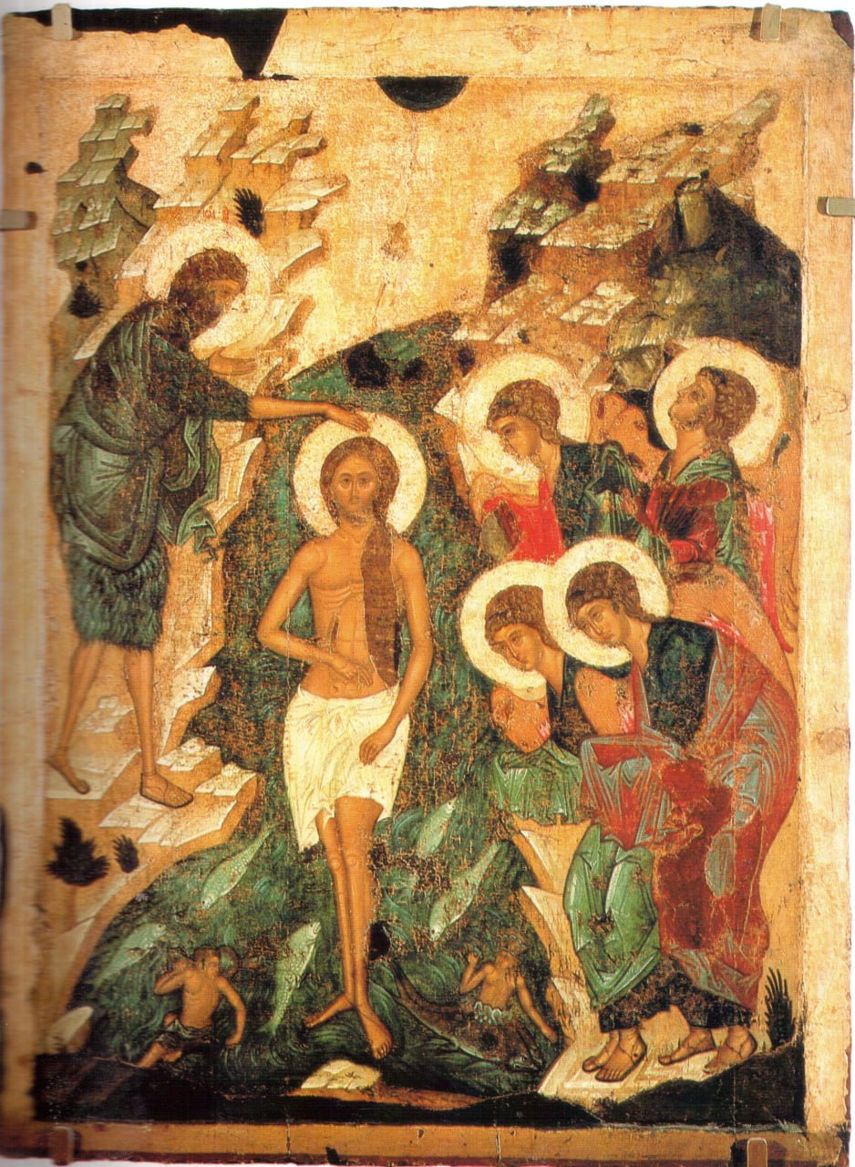 Одна из стихир праздника: Крещается Христос и восходит от воды, совозводит бо с Собою мир и зрит разводящаяся Небеса, яже Адам затвори себе и сущим с ним, и Дух свидетельствует Божество, Подобному бо предтичет и глас от Небесе: оттуду бо свидетельствуемый, Спас душ наших.