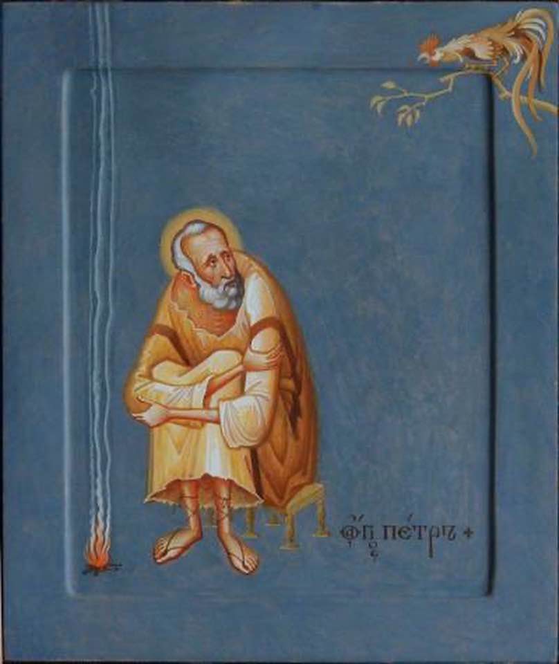 This is the loneliest feeling icon I’ve ever seen. St Peter, trying to warm himself by a scrawny little fire, as the cock crows, and Peter realizes that he’s done exactly what he said he wouldn’t. He’s denied Christ three times in a row. Lord have mercy on us all for our daily little denials of our Lord! St Peter pray for us!