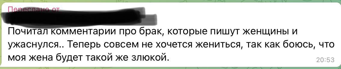 Мудрый мужчина, читая жесткие комментарии женщин, сможет найти для себя здравые мысли, которые использует во благо в своей семье. Также и мудрая женщина, прочитавшая злость мужчин на женщин в мужском чате, найдет для себя полезное, чтобы стать еще лучше для своего мужа. А глупый человек будет обижаться, начнет искать для себя что-то легкое и приятное, но совсем далекое от реальности и пользы.