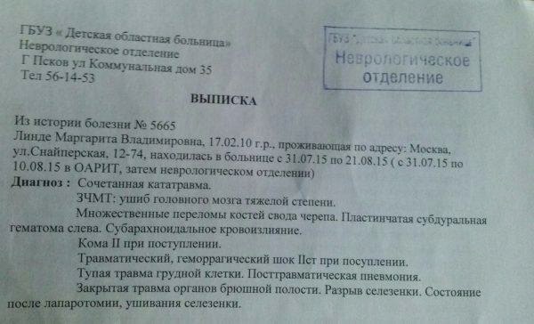 Приезжаем во взрослую – а оттуда отправляют в детскую “У нас лицензии на лечение детей нет. Нейрохирург к вам сам приедет”. В общем, Рита оказалась в реанимации спустя два часа (!) после травмы. За это время она потеряла больше половины (если не 2/3) крови (разрыв селезёнки, внутреннее кровотечение, плюс “скорая” решила, что нужно повысить давление, и хлестать начало ещё сильнее). Не понимаю, как её вообще довезли живой. А у приёмного покоя меж тем стоял без дела новенький симпатичный реанимобиль, очевидно, “только для псковичей”.