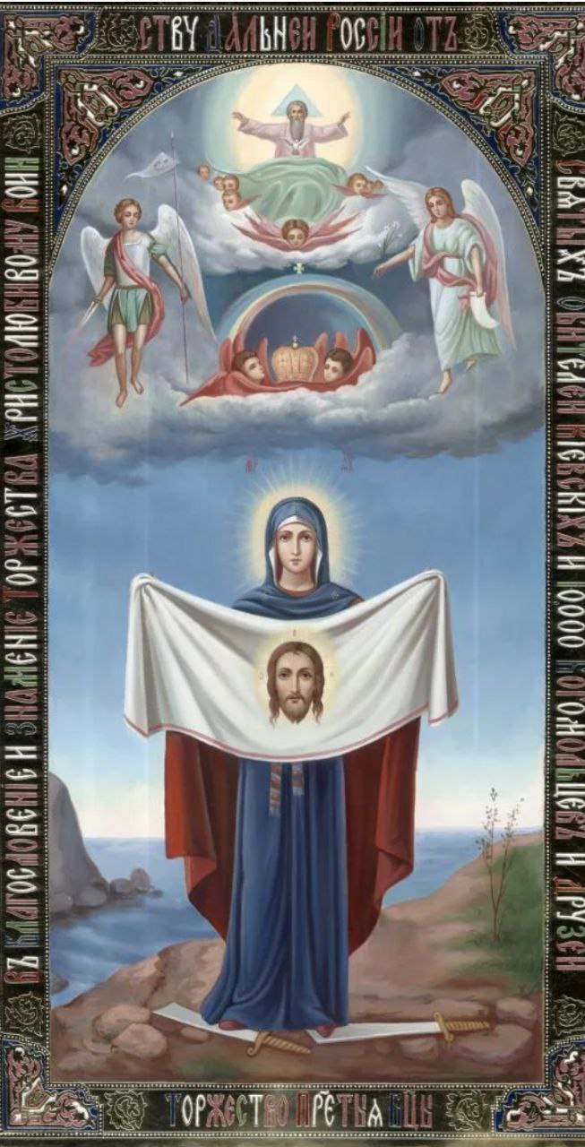 Она пришла ровно такой, как на этом образе: на фоне залива, с платом с ликом Спасителя в руках, с архангелами, Господом и царской короной над Ней и поломанными мечами под Ее ногами -символом прекращения войны.