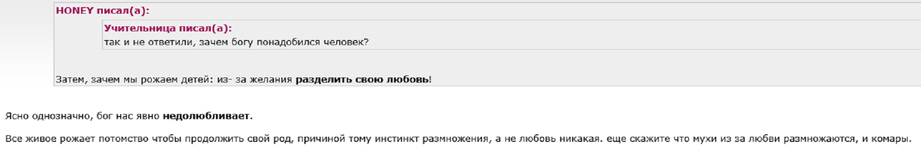 HONEY писал(а): Tatmilka писал(а): Стоит посмотреть фильм Звягинцева "Нелюбовь". Вот этот ужас теперь в наших семьях повсеместно, нормой стало. Я бы даже общество теперь назвала одним словом "нелюбовь". Спасибо большое! Посмотрела на днях и да, впечатляет. А буквально вчера в соседней теме вспомнила о нём. Совокупляются, размножаются как мухи и под любовью подразумевают что угодно, но только не саму Любовь. Это у нас бабушка (Учительница) шутит  На самом деле она и умная, и добрая... просто вредничает иногда... бывает  Постараюсь сегодня по её вопросу "зачем Бог создал человека?" тоже высказаться.