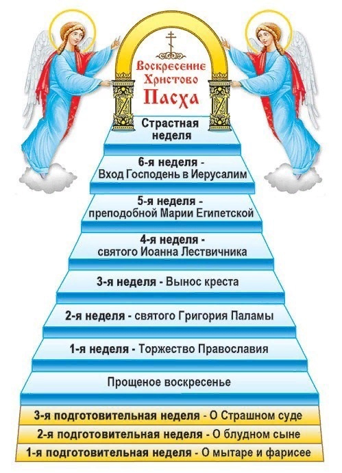 5 марта - Неделя первая. Торжество Православия. 12 марта - Неделя вторая. Святитель Григорий Палама. 19 марта - Неделя третья. Крестопоклонная - вынос на поклонение Честного Креста Господня. 26 марта - Неделя четвёртая. Преподобный Иоанн Лествичник. 29 марта вечером - Стояние Марии Египетской. Чтение полностью Великого покаянного канона Андрея Критского с добавлением чтения жития преподобной Марии Египетской.