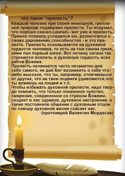 "В прелесть человек попадает или по неопытности, или от гордости. И если по неопытности, то Господь скоро исцеляет, а если по гордости, то долго будет страдать душа, доколе не научится смирению, и тогда исцелит ее Господь. В прелесть мы попадаем, когда думаем, что мы умнее и опытнее других, и даже духовника. Так я по неопытности подумал, и за это пострадал, и очень благодарю Бога что Он этим смирил и вразумил меня, и не отнял у меня Своей милости. И теперь я думаю, что без исповеди духовнику невозможно избавиться от прелести, потому что духовникам дана от Господа власть решить и вязать."
