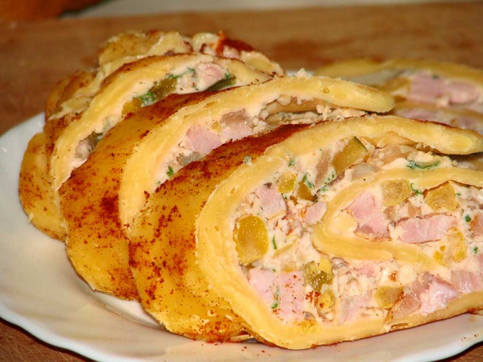 Девочки, я вчера тут мимо пробегала, изошлась слюной пока все прочитала. Какие вы все молодцы! А kitty так вообще кулинарный кладезь А сегодня я пробегала мимо одного ЖЖ, и увидела там рецептик, дуумаю может тоже пригодится здесь. На вид аппетитненько! " Сырный рулетик. Принцип приготовления блюда увидел по телевизору, а затем, дождавшись вдохновения и соответствующего случая, повторил. Итак, в этом блюде самое главное сыр. Я его взял приблизительно грамм 600. Половина российского, а вторая половина голландского. Мне кажется, что можно брать любой другой сыр, от этого менее вкусно не получится. Итак, сыр трем на крупную терку, ссыпаем в герметичный полиэтиленовый пакет и опускаем в кипящую воду. В воде он должен находиться, пока не растает, по опыту это минут 15-20. В это время мы готовим начинку. Слегка распускаем пакетик сливочного масла. В него добавляем столовую ложку хрена и пару ложек майонеза. Все тщательно перемешиваем. Добавляем мелко порезанное копченое мясо, горсть порезанного укропа, кукурузку и половинку соленого огурца. Пока делается начинка – сыр уже расплавился и ждет, когда мы его быстро, на вощеной бумаге раскатаем в корж толщиной миллиметров пять. Выкладываем на корж начинку и скатываем в рулет. Присыпаем рулет сверху сухой паприкой, заворачиваем в эту-же вощеную бумагу, перематываем ниткой и в холодильник застывать. Как сырный рулетик охладится – разрезаем, наливаем, выпиваем и, естественно, закусываем. " (рецепт и фото вот отсюда)