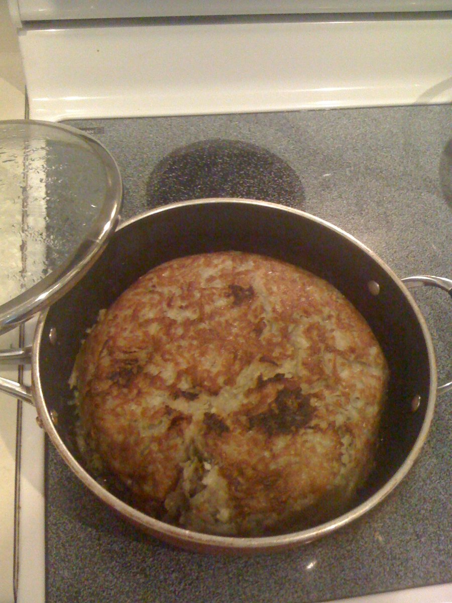 Когда придёт время переворачивать - не надейтесь на лопаточки - вы всё развалите! Я всегда накрываю большой тарелкой, и переворачиваю сковороду. И потом с тарелки - обратно на сковороду. У меня есть фотка, правда немного неудачная, так как он слегонца подгорел, но я все равно выложу, чтоб смогли ориентироваться по таре и объёму