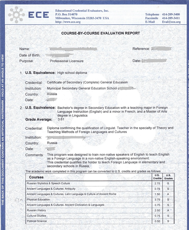 Waterlily писал(а): Девушки, кто делал переоценку в ЕСЕ, там в анкете-заявке есть графа о перечислении всех учебных заведений, где учился. А если я училась в школе и двух ВУЗах, как будет идти ОПЛАТА- как за одну эвалюацию или как за 2 диплома разом? Спасибо. Вы отправляете один диплом? Или оба? Я делала 1 диплом, Course-by-course, с меня спросили еще школьный аттестат. Платила только за диплом, в эвальюации написали что есть еще школьный аттестат. Позвоните им, не бойтесь