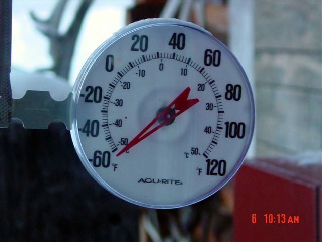 Набрела на это фото в местной газете, для вашей коллекции впечатлять знакомых :-). Хотя не помню, чтобы в феврале 2008 года были рекордно низкие температуры, но этот термометр показатель того, как погода может разнится здесь на расстоянии лишь нескольких километров. Допустим в нашу низину как сползли холодные массы в декабре, так и сидели весь декабрь и январь, хотя чуть выше в 10 милях было значительно теплее и народ не верил, что у меня термометр за окном не поднимался до -25С, а сидел на -30-40С большую часть зимы. Даже через дорогу может быть другое ощущение. Аляска - сэр! :-)