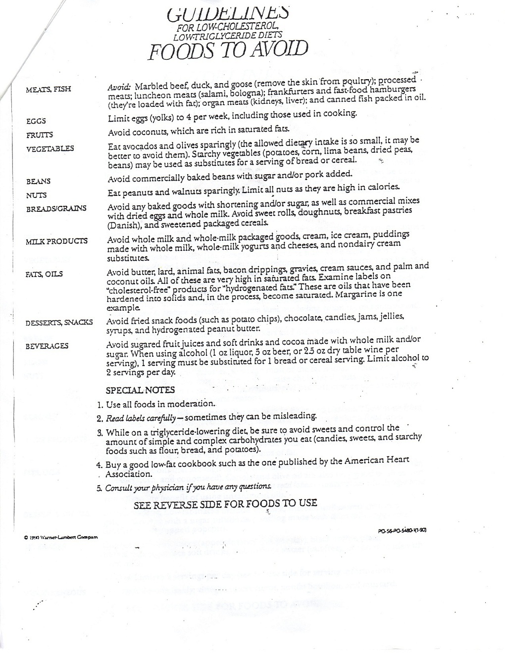 SunnyAKМне врач дал просто бумажку, Guidelines for low cholesterol low-triglyceride diets foods to use. Вот ссылка: http://www.americanheart.org/presenter. ... ifier=4778 Там написано брать белки из lean meat, poultry и в для многих людей 6 oz (170 граммов) мяса достаточно в день. Отсканировала свой листочек специально для форума. P.S. Ладно не смейтесь насчет моего 500 калл снека, не считала в рацион каллорий потому что не ем каждый день, раз в неделю иногда.