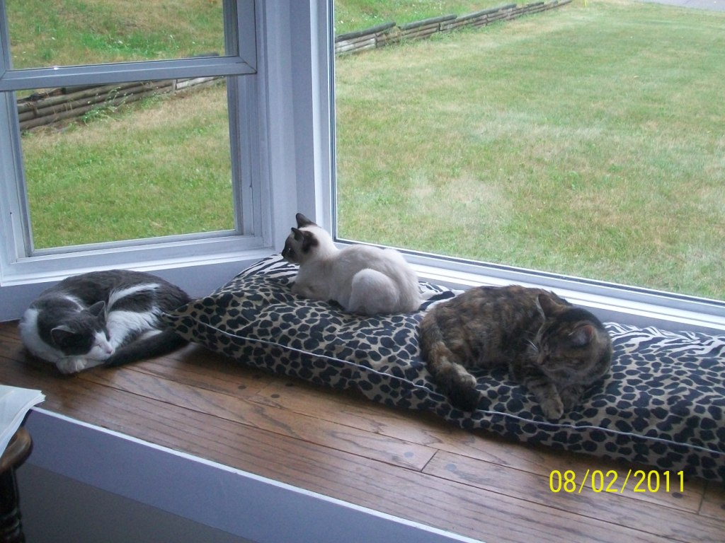 А вот и все тврое рядышком, редкий кадр. Мальчики шумные, девушка не любит с ними дружить. Феликсу вчера три года исполнилось, Пэнси около 2,5, БлэкДжеку год с хвостиком.