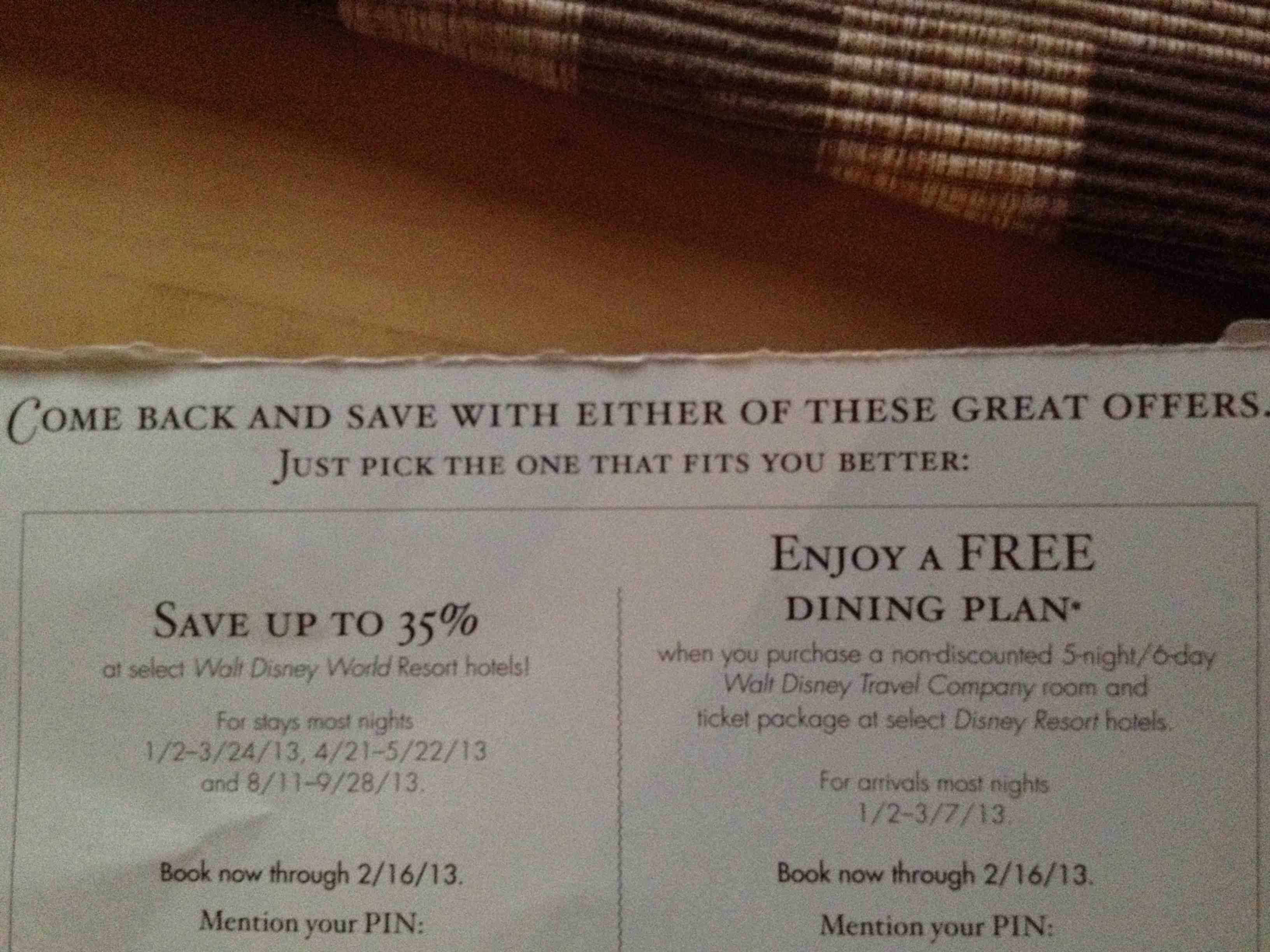 HELENKA писал(а): Девы,а где можно найти дилы на билеты в Диснейлэнд,Орландо? У меня есть предложение на 35% офф 1/2- 3/24/13, 4/21- 5/22/13, 8/11-9/28/13. Нужно зарезирвировать на эти даты до 16 февраля. И фри дайнинг плэн по условии , что вы зарезервирете 5 ночей по полной стоимости в Дисней отелях.