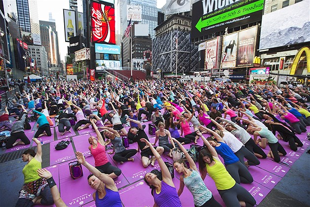 June 21, 2013: A group of people gather in New York's Times Square to participate in a yoga session in the morning on June 21. The event, called "Solstice in Times Square," was designed to bring thousands together to welcome the longest day of the year.