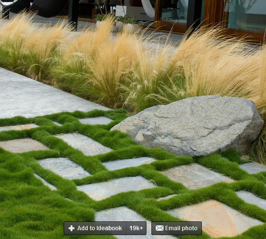 Трава, на которую можно наступать- та, что садят между каменными плитами кажется foot stepping grass называется. Она продается уже готовыми контейнерами на на этикетке след от ступни нарисован.