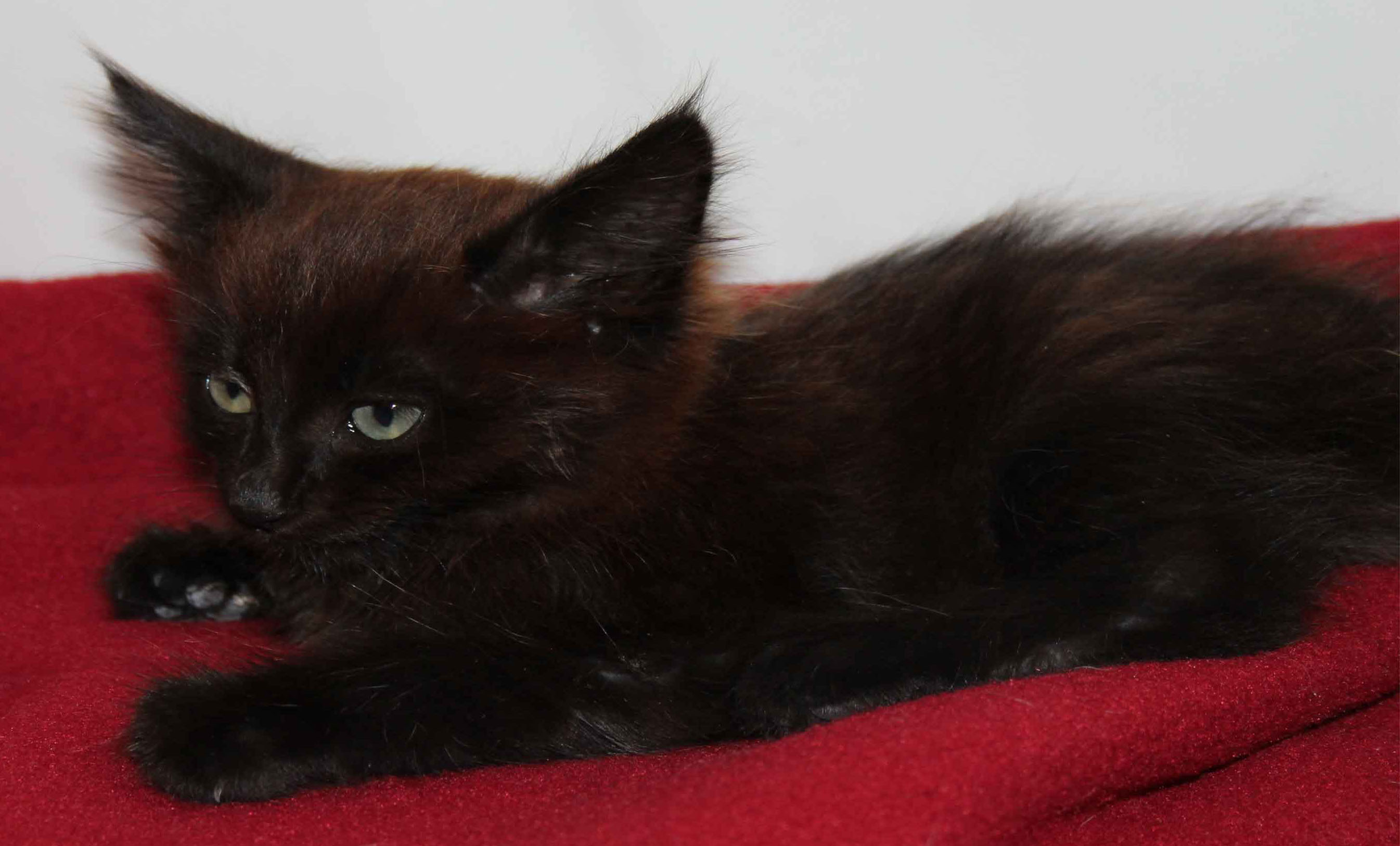 а такого мы взяли. на второй или третий день. цвет был необычный очень черно-коричневый, мы его сначала брауни назвали, он такой тихий и скромный был а потом обнаглел, всех кошек бьет. коричневая шерсть исчезла, начали появлятся белые. полезла в инет и выяснила что он ангорский да еще с редким black smokie окрас