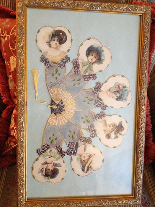 фотки щас просматривала, какие же красивые вещи на этих стейт-сейлах встречаются! вот думаю, побежать, что ли, еще такую лампу купить? хотя мне уже и не надо ламп в доме... А вот такой веер в рамочке у них дома был (не люблю чужие лица и старые фотки в доме. Но сама идея, и как оформлено, очень понравились!)
