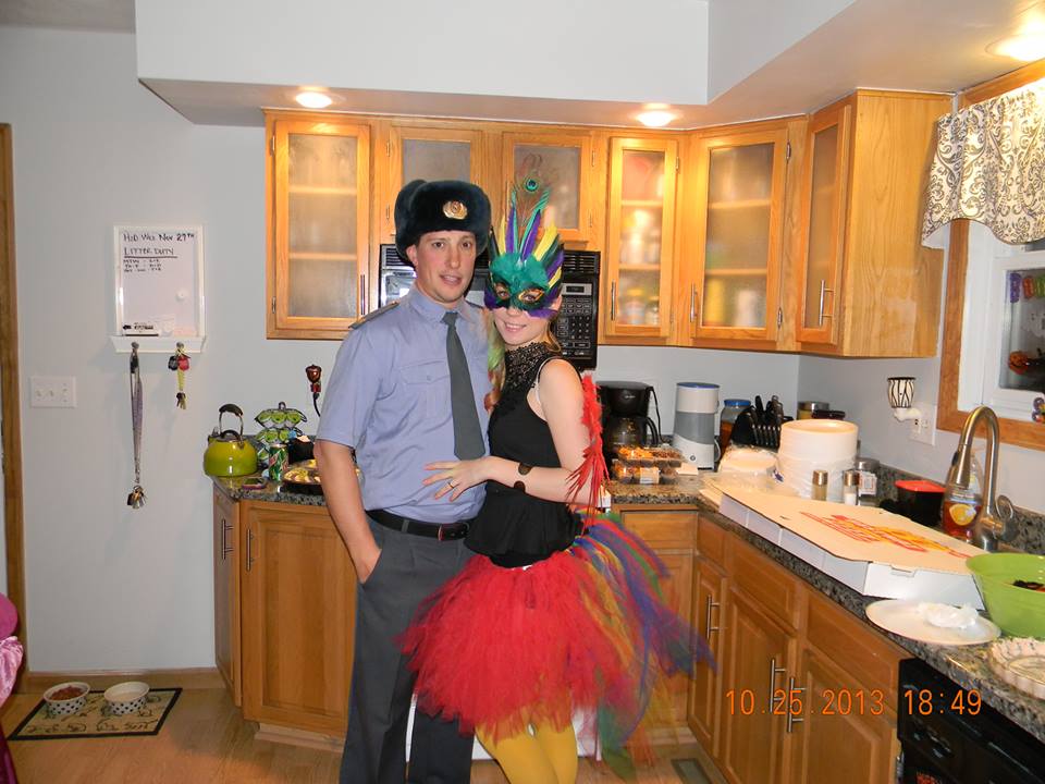 Опенбук, муж - русский мент во всей красе, причем костюм - настоящая форма, у меня отчим до пенсии был начальником милиции.. Я, кстати, всегда хотела что-то страшное сделать - у меня хорошо получается макияж делать разный, думала в этом году что-то из The Walking Dead придумать, но почему-то у меня толи суеверие - не могу я на себя ничего подобного нацепить... Мне ваш костюм напомнил мое платье на выпускном в школе  - я его из России привезла в сентябре, темно-бардовый бархат с вставками из черных кружев и шнурков из кожи... думала вампиром одеться в нем, но так и не решилась