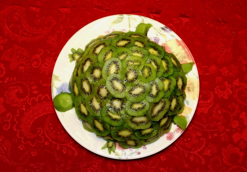 В рецепте он назывался "Малахитовый брасле"т и выкладывался кольцом, как "Гранатовый браслет", но повторяться не хотелось, и кромсать красивенький киви не хотелось, поэтому я его немного изменила внешне