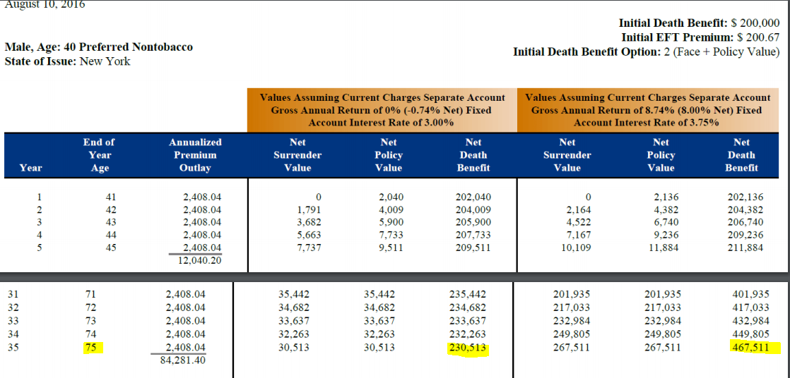 di писал(а): муж выходит на пенсию 40 лет, жене 38 лет. Его работа предлагает 240$ минус из его чека каждый месяц за 2000$ в месяц жене страховка в случае его смерти. Выгодно ли, учитывая возраст супругов или вкладывать в акции? Спасибо! Для этого случая , как и для многих других , идеальным является открытие полиса VUL ( Variable Universal Life) , суть которого заключается в том , что небольшая часть платежа идет на покрытие страхования , а его большая в инвестиции . То есть и страховка есть , и деньги работают. Основные преимущества: 1) Это постоянный страховый полис , а не временный. 2) В нем аккумулируются наличные , которые можно по необходимости взять через низкопроцентные или беспроцентные ссуды. 3) Деньги растут без уплаты налогов 4) Страховая сумма также не облагается налогом. В приложении , я сделал иллюстрацию для Вашего случая. Смотрите предпоследнюю и последнею колонки . Там очень хорошо видно , как растет со временем cash value и страховая сумма. За те же 200$ в месяц , можно получить гораздо более лучший продукт. С уважением.