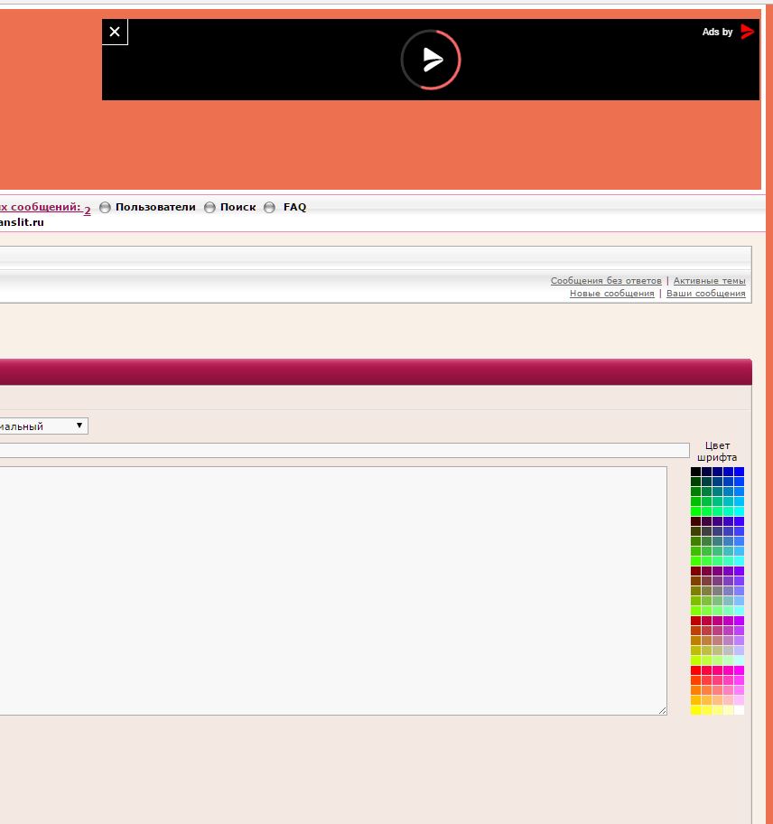 Nicole+ писал(а): Nicole+ писал(а): sxqsxq писал(а): что значит "выбрасывает" - вы открыли форум, щелкнули на "ответить" страница должны перезагрузиться и на ней должно быть то что я приводил как пример. У вас что? на каком шаге выбрасывает и куда выбрасывает? открывается что-то? вообще окно с форумом закрывается? или .... Нажимаю «ответить», появляется окно для печатания, начинаю печатать- не печатается,или печатается экстремально медленно и в какой-то момент (сразу, вначале печатания или при попытке отправить сообщение)окно самозакрывается и меня выкидывает туда откуда пришла, т.е. в тему форума, куда пыталась сделать коммент. Вот сейчас опять такое, печатают вам в Word, потом копирую и помещаю, но даже после этого иногда окно исчезает и тебя выкидает в форум...щас попробую отправить это, напечатанное в Word сообщение. PS Когда начинаю печатать буква не выскакивает сразу, т.е. заедает,жду-пожду пока выскочит, потом другую также...а когда быстро печатаю, вернее в обычном темпе, сразу выбрасывает или спускается вниз. Попробуйте после открытия страницы где вы вводите текст немного подождать и ничего там не делать, пока загрузится все содержимое. Может действительно гугловский банер блокирует работу окна, пока загружается его содержимое.