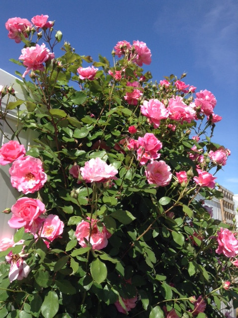 Ещё одна. Муж притащил из Лоуса, без опознавательных знаков. Цветки тёпло-розового цвета, собраны в клайстеры на конце длинной ветки. Ветки длинные 2 метра где-то и очень упругие. Тренировать как клаймбер непросто - ветки ломаются. Такое ощущение что это не клаймбер, а просто гигантский куст. Без запаха, блекспотилась страшно в середине лета. У меня было подозрение что это Cl. Queen Elizabet или Bonica