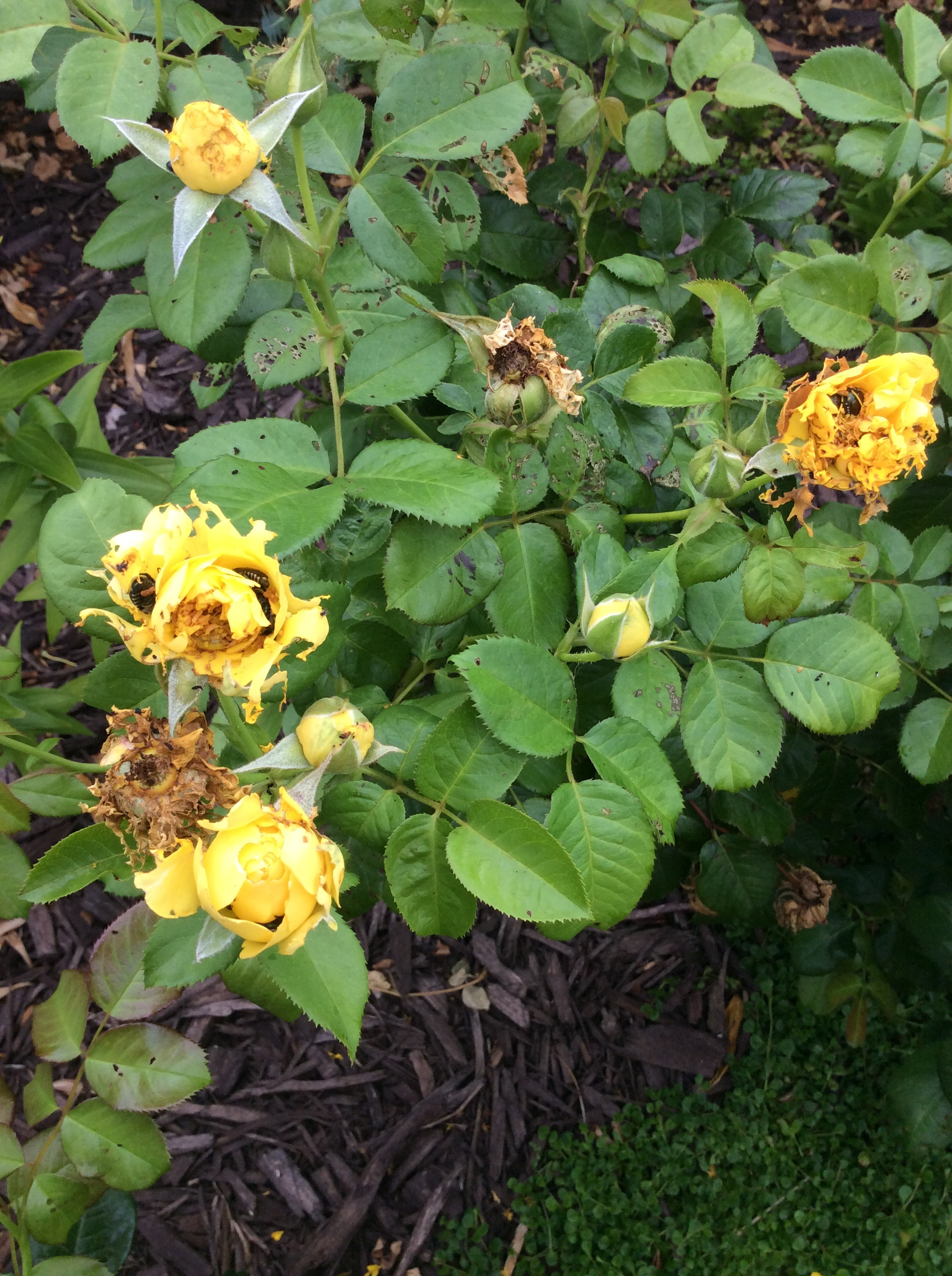 Baylee писал(а): Tortoise писал(а): 60 кустов роз!!! Это ж мечта. Сколько земли нужно для 60 кустиков? У меня два всего Пора уже лист составлять по розовым кустам: Кисмет- 60 с лишним Леночка- 40 с лишним . . . Бейли- 4 без лишнего Tortoise- 2 И тут слышу тихий шёпот Зузы: а у меня *53  Ой, я всё. Сокращаюсь ))) Меня жуки одолели, чессслово... Буду сокращать и заменять свои "не бе\ни ме" розы на дрифты и карпеты, которых жуки не жрут. Ща, Розамунду подобью тоже на это дело Вот жуки как листья пожрали на первой фотке. На второй, они в цветах зарылись и едят их Good Life, бутон только надкусили и бросили. Фу. Сорри, что показываю вам эту гадость. Ну зато, хоть знать будете)) Как мне тяжело