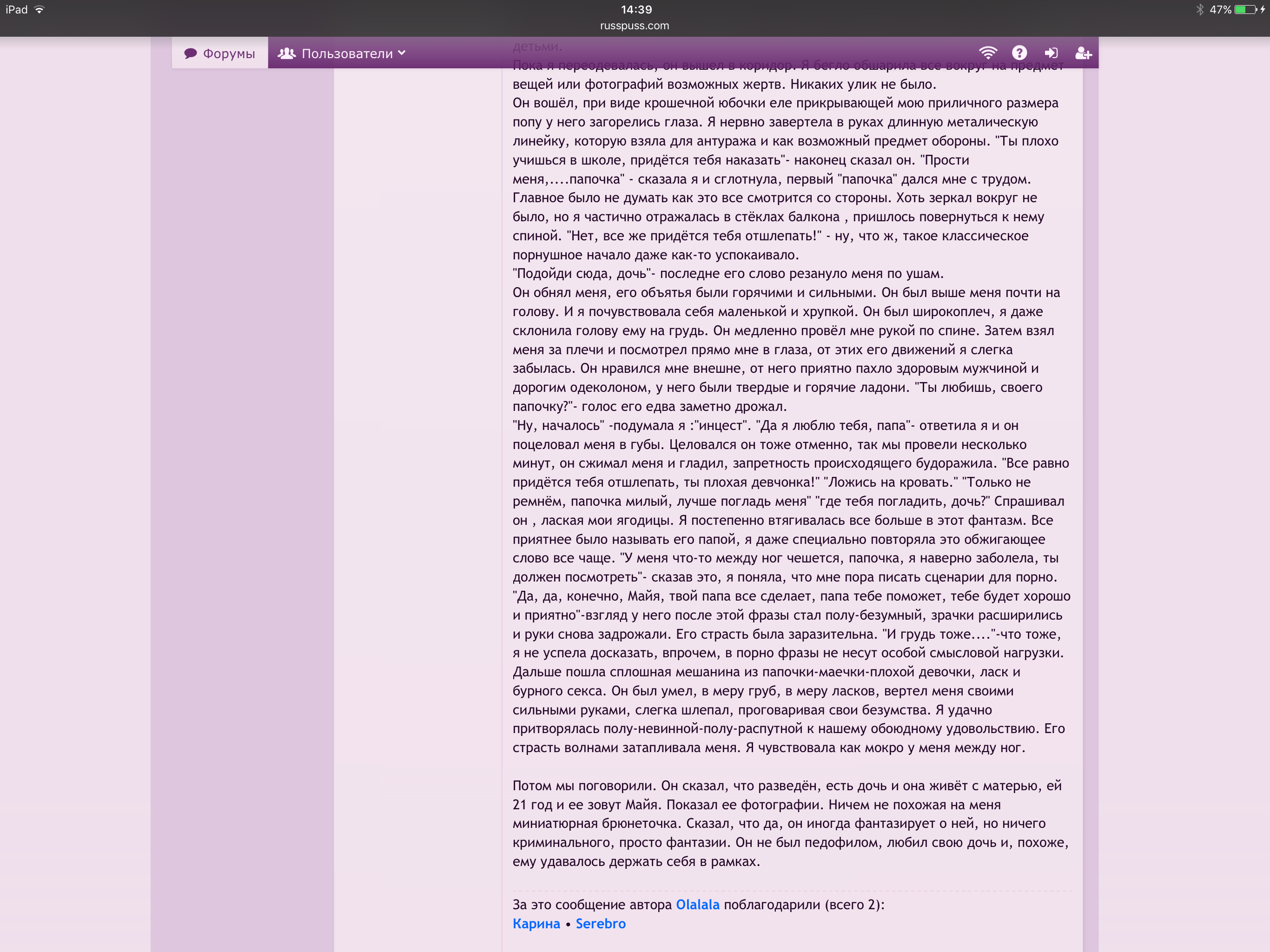 kamellia писал(а): Не знаю как насчет педофилии, но некий культ дочери в америке действительно существует. Не задумывалась и не обращала внимание раньше, но Гудли сподвигла. Хоть я ее тексты целиком не читаю, но пробегаю глазами, и везде об этой педофилии и маленьких девочках. Стала присматриваться, есть такая фигня здесь и правда, папаши к дочерям слишком неравнодушны Во, я тоже думала, у Гудли воображение разыгралось (или крыша совсем уехала) и заело пластинку на эту тему. Но тут у насиков наткнулась на обсуждение форума эскортниц и одно сообщение было прямо в тему. Особенно последний абзац удивил, отец (родной!) мечтает о 21тилетней дочери. И он не один такой.