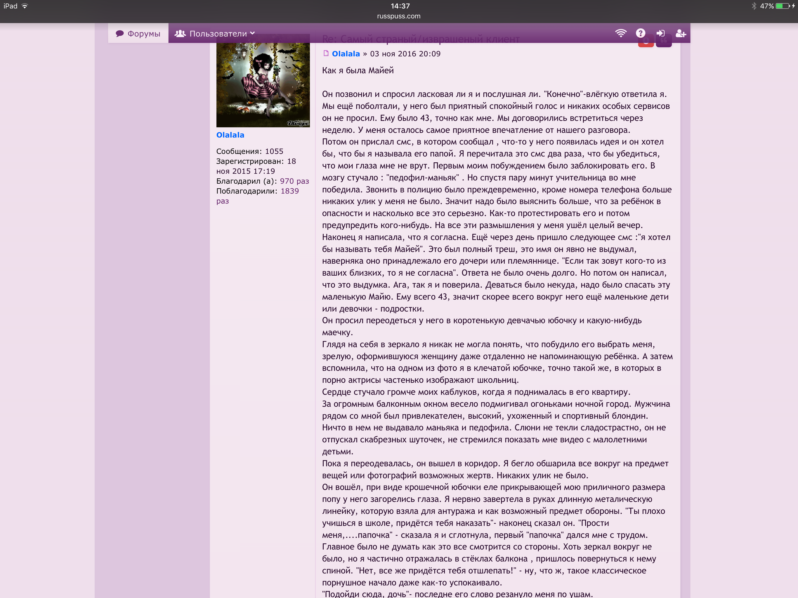 Fantastica писал(а): Одна красочно пишет о педофилии у своего бойфренда. И откровенно говорит о том, что если бы даже узнала, что он трахал ребенка, то для нее бы это не имело никакого значения. "Ну было и было,"- ее слова. И весь форум ей рукоплещет. Правильно! Пиши еще! Как она интересно пишет! Правда, потом опрадываются, что про педофилию якобы никто не читает. Ну т.е. если про педофилию пролистывают, то этого как-бы и нет. Как-бы разговаривают с порядочным человеком. Про Амалию тоже давно ясно. Что из себя представляет, и чем занимается. Правильно! Свободная страна! Не, я щитаю, нужно всякую энергию направить в нужное русло. Вот хочется вам, Фантастика, порядочно обличить педофила, пожалуйста, на предыдущих страницах указали, что Пантерка опять на форуме. Займитесь благим делом, спасите форум. На Гудлиных персонажей праведный гнев распылять много ума не надо