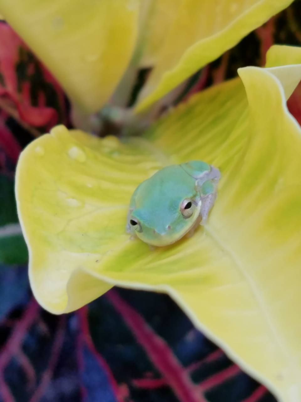 Ну и наши маленькие флоридские радости: лягухи и кротоны... или кротоны и лягухи... ну, неважно, все поняли. Лягушонок оказался редкостной флегмой: как мы вокруг него с камерами ни прыгали (включая собаку)- с места не сдвинулся... ближе к ночи перебрался на входную дверь ... завидное спокойствие