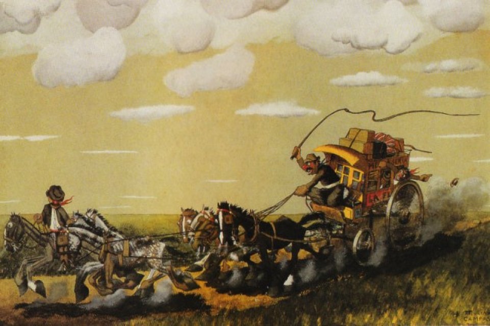 Помечтаю вслух. Когда разбогатею (и если разбогатею)... спущу все $$$ на Florencio Molina Campos иллюстрации... Все-все-все скуплю! Помните в «Золотом Телёнке» крылатую фразу - «на волю! В Пампасы!»? Я маленькой ходила по дому с рюкзаком и напиханными в него игрушками, и повторяла как заведённая ”уйду на волю, в пампасы”. Откуда? Почему? Родители до сих пор стебутся. И казалось мне тогда, что Пампасы - это такая обетованная солнечная земля, где у всех всё есть и все свободны и счастливы и жрут мороженку. А не сидят в промозглом Питере с соплями и на дождь через стекло смотрят Так вот, уже в зрелом возрасте открылось мне что Пампасы - степь, жара и ничего вокруг. Разочарование и не уйду теперь. Но любовь, любовь-то осталась! Вот она, любовь!
