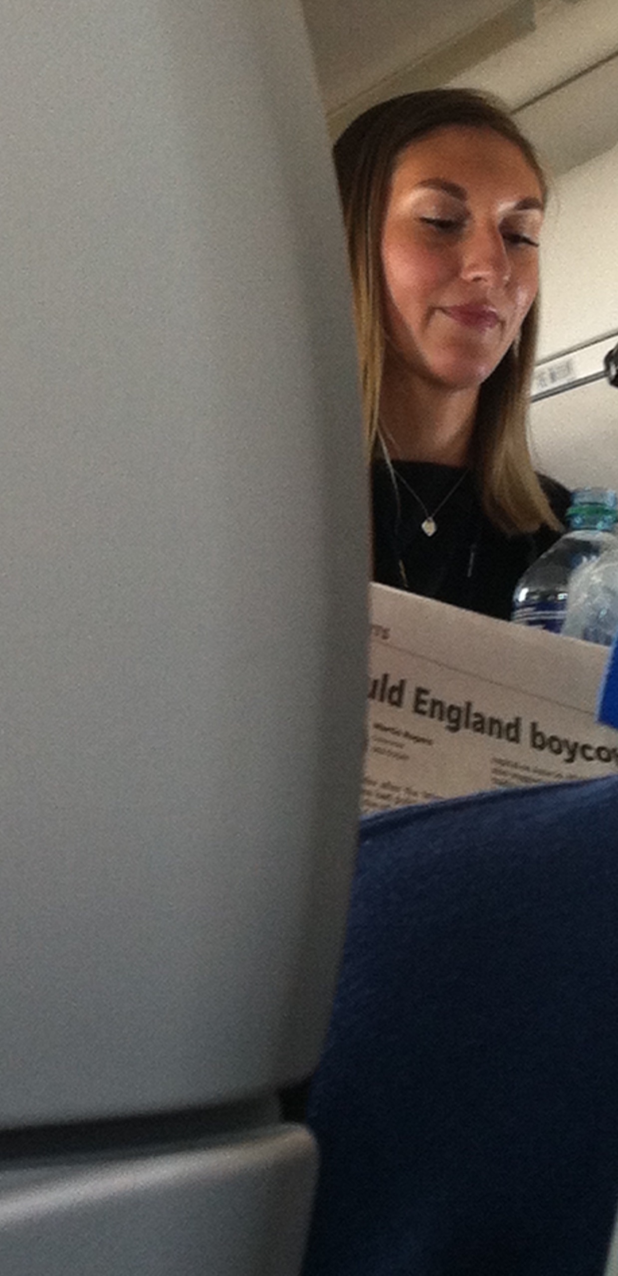 Летела двумя самолетами. На первом стюардесса была жаба-жабой и по поведению жаба тоже. На втором... я даже не смогла удержаться от фотографирования исподтишка. Очень красивая ( фотка не передаёт всего), чем-то похожа на Леру Кудрявцеву. Прямо вся светилась. А главное -поведение. Было впечатление, что она балдела от каждого своего движения. Такой магнетизм.