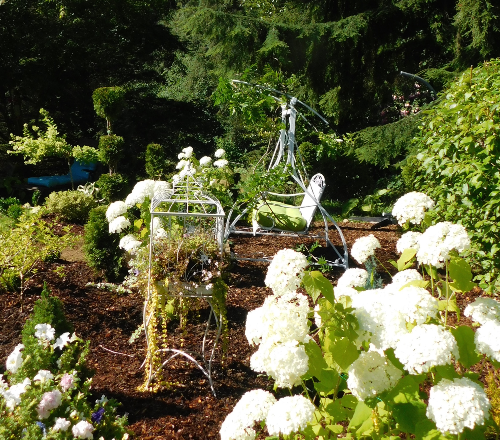 Ой... люди перцы выращивают А я хотьбыж драный пучoк укропа вырастила ....ничего.... Я только романтичское могу- сделала дочке салатово- белый уголок с качелькой ( кстати, Сонотик) из белых Аннабелей и самшита с туями. Все растюхи еще маленькие, второй год. На качелю по верху пустила вистерию Самшиты веточки еще кривые- косые по бордюру- ну ничего, вырастут . Там где собака валяется -будет каменная дорожка к качельке ( сын обещал слезно) жду второй год .... Зато припер купальню для птиц- заявил, что я такое люблю никогда не была любителем гипса, но ,однако ж.... вписалось.