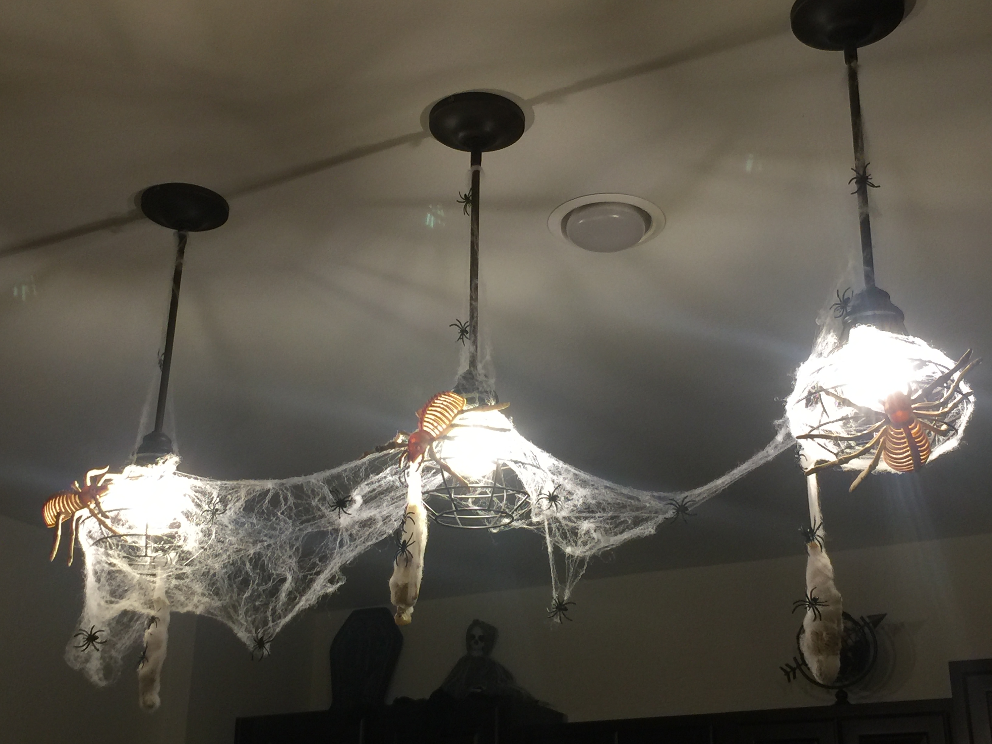 Ну и так как в доме маленький ребёнок, то украшаю только там, куда дочь не может дотянуться. Правильно, люстру и пенданты. Она была со мной в магазине, помогала складывать черепа в тележку. Так смешно было.
