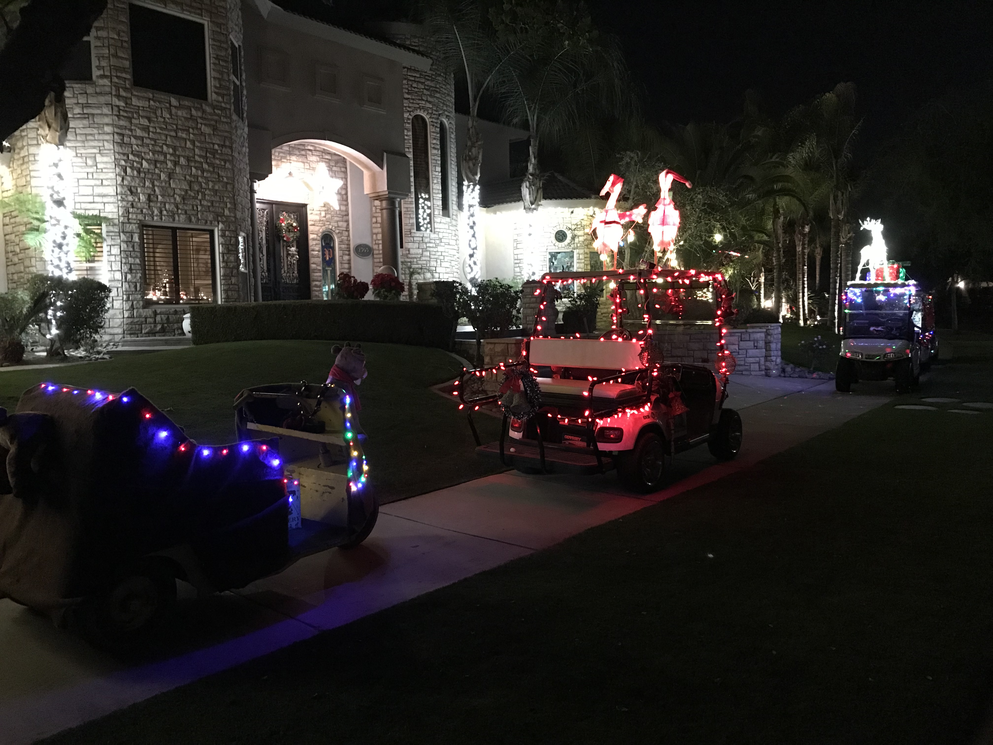У нас в нейборхуде каждый год перед Рождеством наряжают гольф машинки, включают рождественские мелодии... и так катаются на них. Уж извините, что в сумерках фотографировала