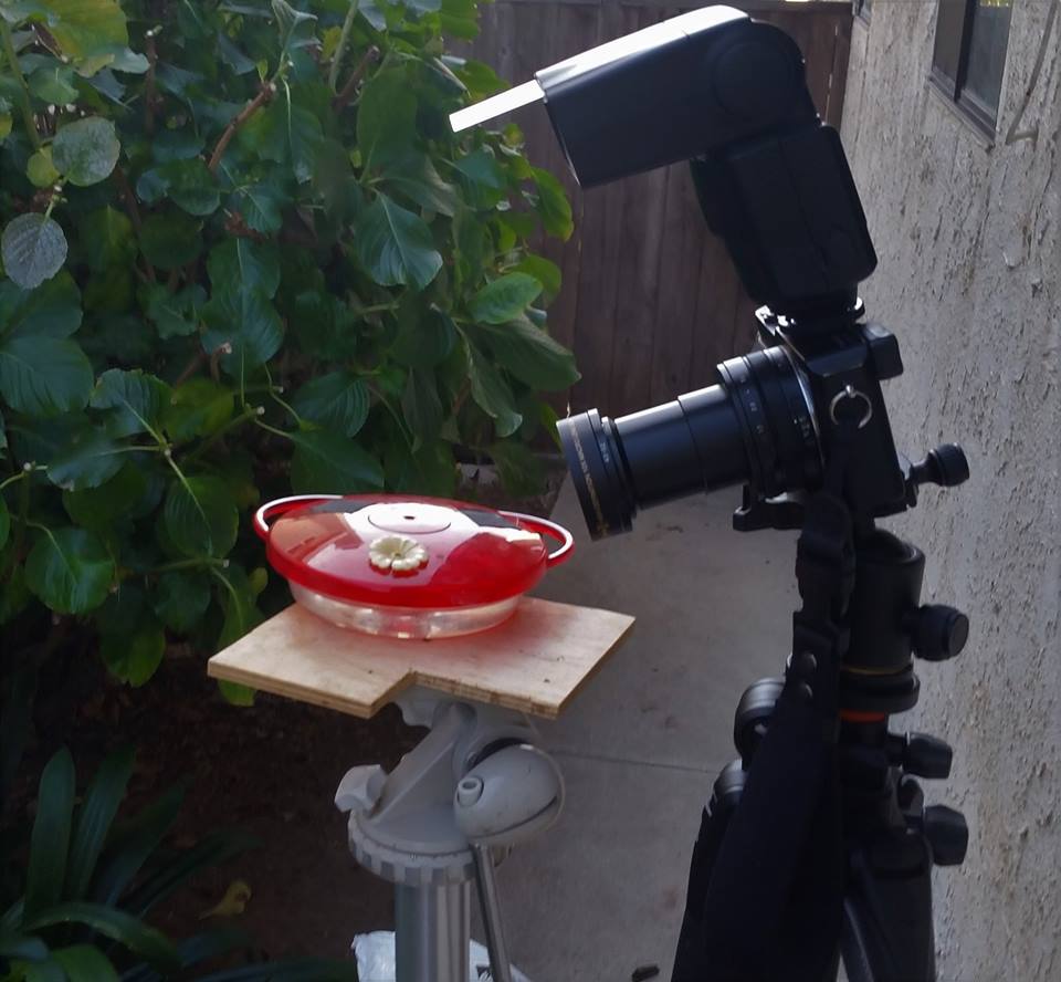 monaliza писал(а): Не люблю я их, они каркают слишком громко. На кормушке у меня теперь белка да Janco чередуются, всех остальных выжили..  ну хоть кто-то, тоже вполне себе достойные объекты Монализ, давай я тут поставлю фотки с колибри (это из нашей с ней переписке в личке, подумала. что, может. кому-то еще будет интересно) - фотки не мои, это товарищ с фейсбука вот так соорудил и вот такие фотки The picture shows the simple setup. The flower is 3 1/2" from the front of the lens. ISO 200, usually 1/32 flash power, f/11, 1/4000 sec exposure to prevent ghosting, manual focus, remote control with Lumix Image App on my phone.