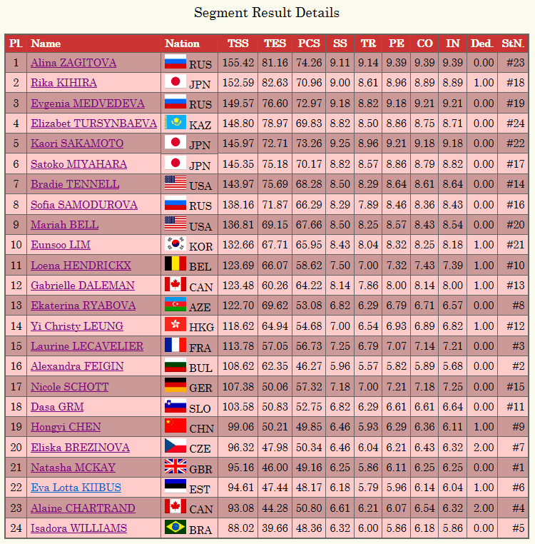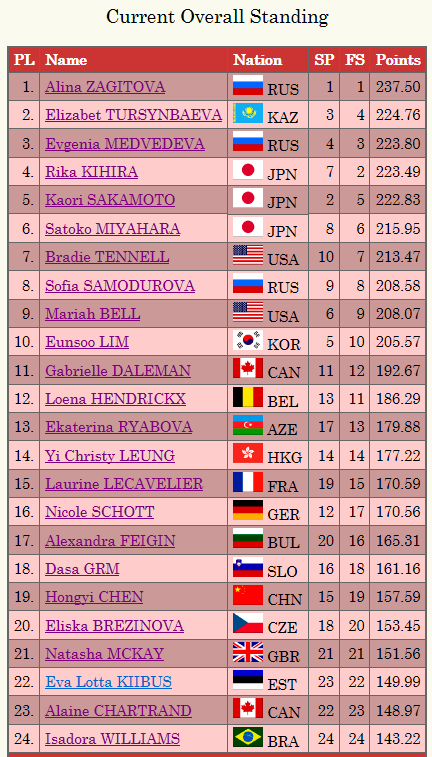 Какой неожиданный и замечательный итог получился у девушек! Шикарный турнир. Алина чемпионка !!!! Японки на домашнем ЧМ и без медалей. Женя молодец. Тутберидзе конечно крута - три ученицы на пьедестале . Элизабет вошла в историю - первая в истории кто сделала из взрослых четверной .