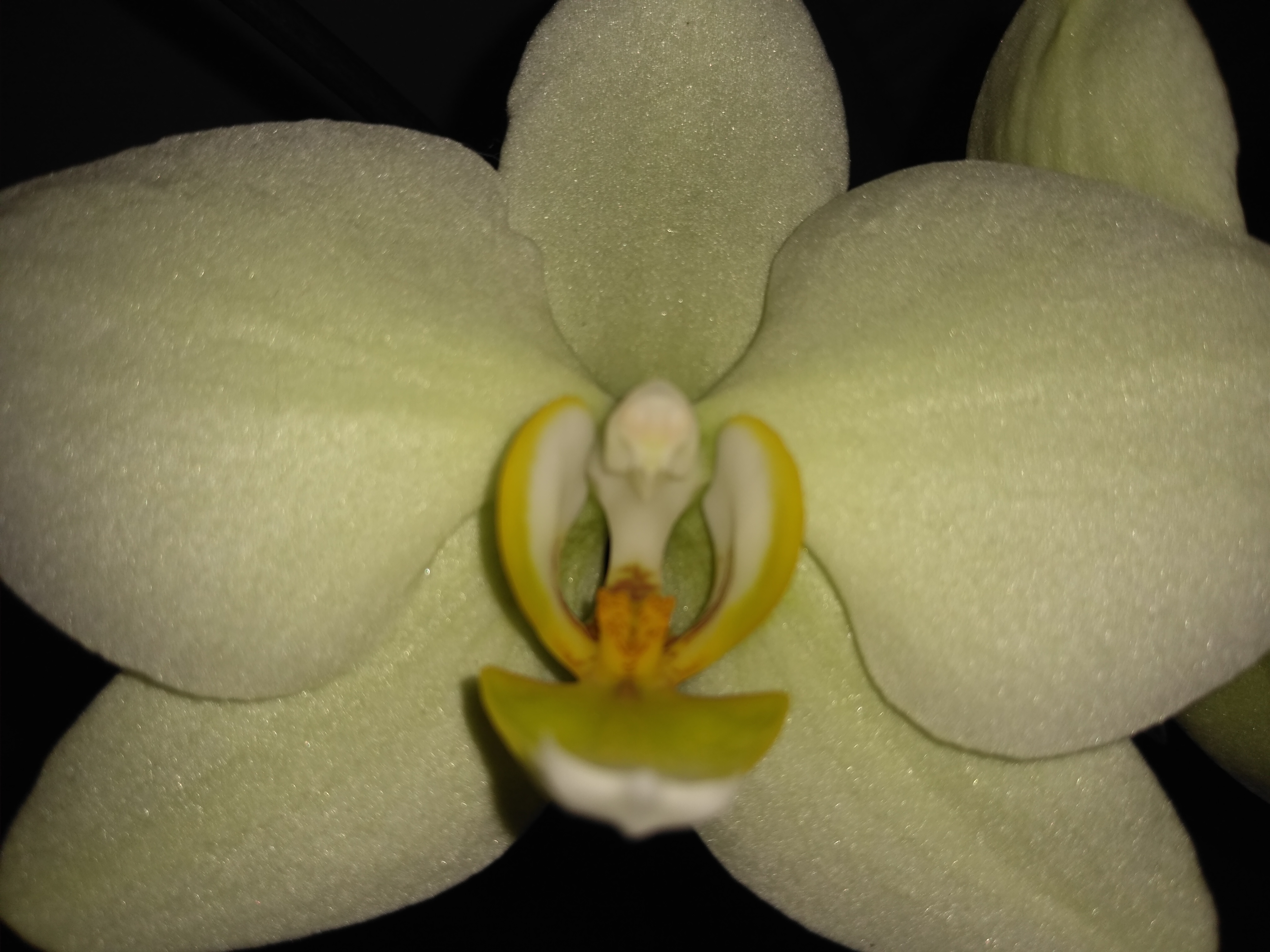 А у меня тоже такие белые орхи есть. Что за сорт не знаю, но цветы большие и цветут уже с февраля. Одна белая, а вторая немного салатного цвета. Вот попробую ее цвет передать со вспышкой. С сантиметром не получается сфоткать. Надо чтоб кто то его держал. Белая 4,25 а салатная 4. Это первое цветение.