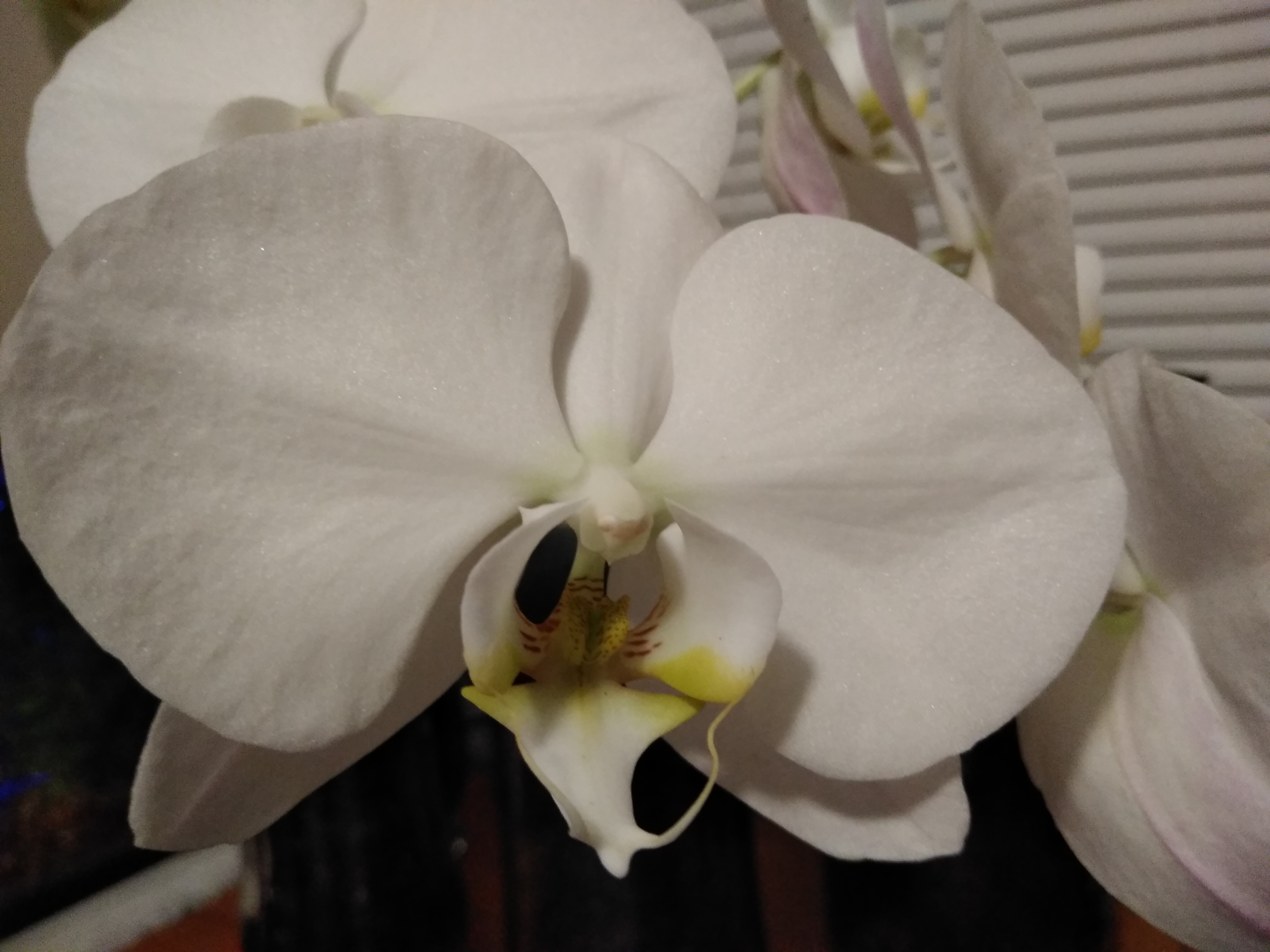 А у меня тоже такие белые орхи есть. Что за сорт не знаю, но цветы большие и цветут уже с февраля. Одна белая, а вторая немного салатного цвета. Вот попробую ее цвет передать со вспышкой. С сантиметром не получается сфоткать. Надо чтоб кто то его держал. Белая 4,25 а салатная 4. Это первое цветение.