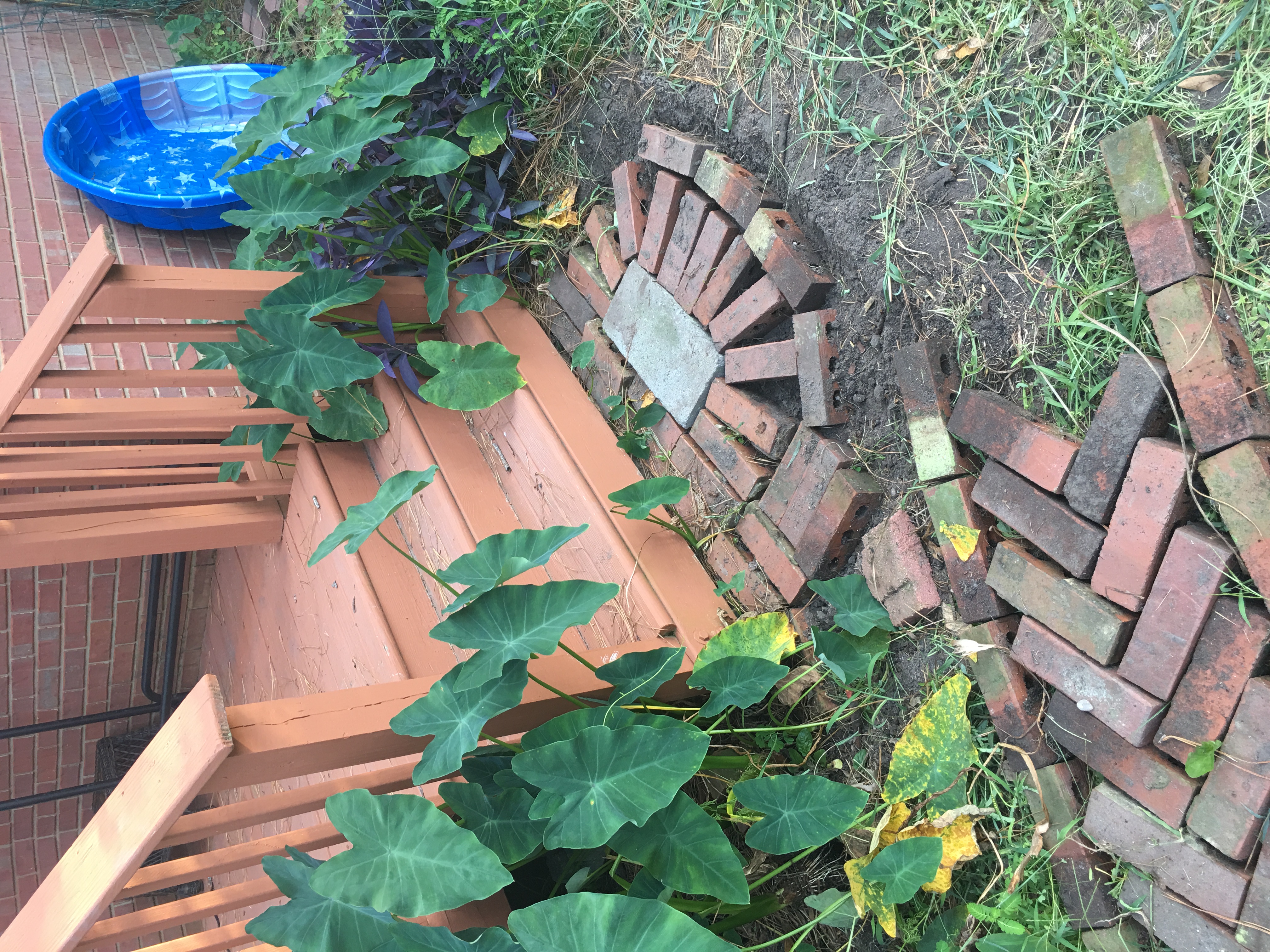 Не заливаю пока. Там где ровно лежат- не гуляют. Дожди пойдут- они вообще в землю осядут. Дочь, на меня глядя, тоже у себя в деревне выложила. Правда, там суровые « челябинские» кирпичи.