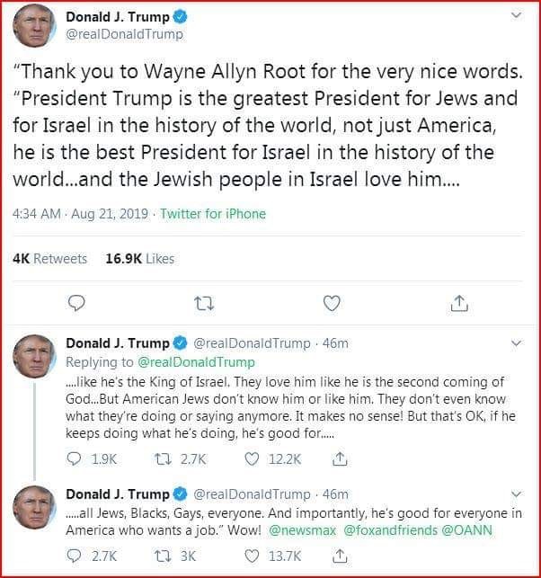 trump tweeted this about himself! "People love him like he’s the King of Israel. They love him like he is the second coming of God." совсем куку https://www.middleeastmonitor.com/20190 ... of-israel/